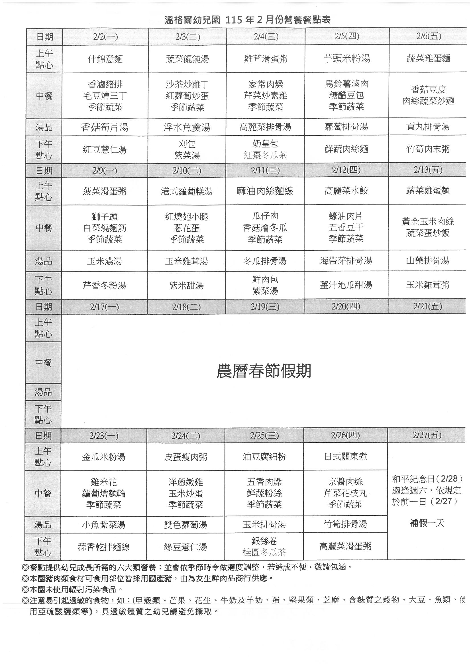 115年2月餐點表